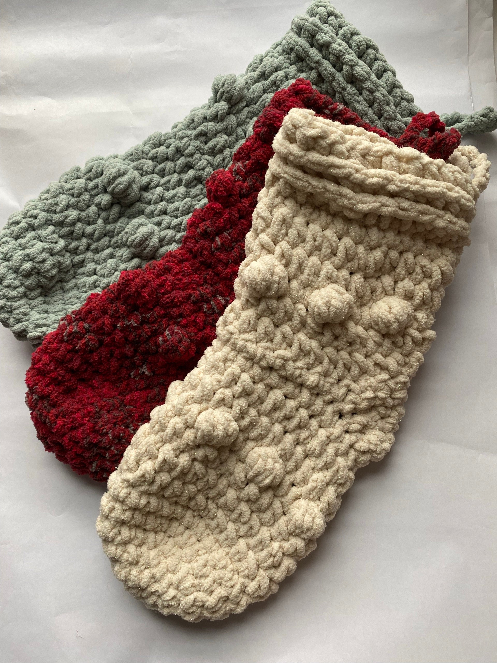 If you would like to make the large stocking in blanket/super bulky yarn, you will need no more than 120 yards total (or 40 yards in each of 3 colors).